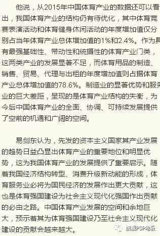 易劍東介紹,2014年10月20日國務(wù)院46號文件發(fā)布3年以來,中國體育產(chǎn)業(yè)取得了長足進展,特別是2015年體育產(chǎn)業(yè)增加值達到5494億元,總產(chǎn)值達到1.7107萬億元,GDP占比達到0.8%,這比2014年的0.64%有了顯著進步,大大超過以往數(shù)年每年增加0.03%的增速。